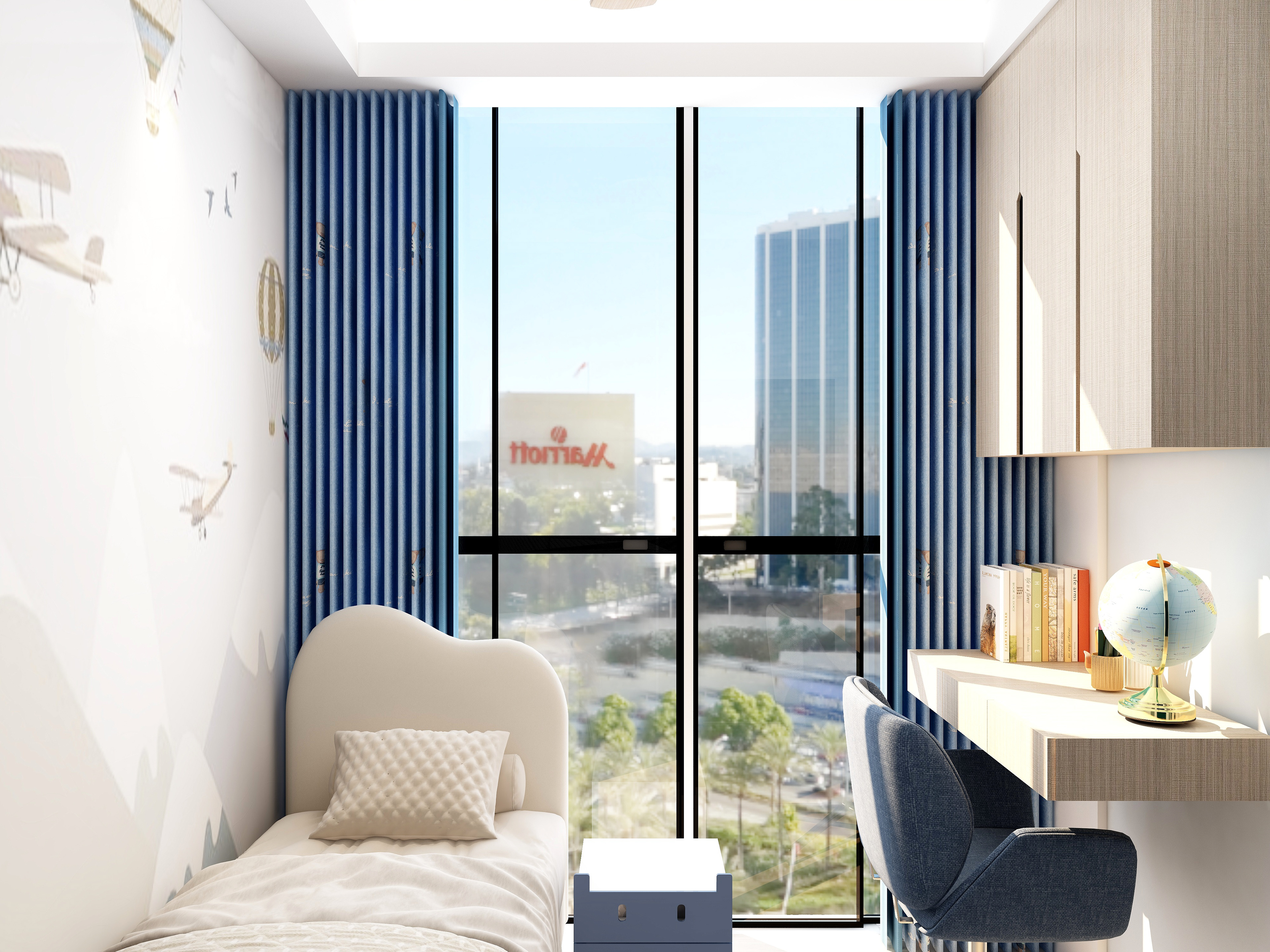 Older son's bedroom is designed with geometric style wallpaper and some wall art and the curtains being simple. To make the space look more design centric, the study cabinet and desk has a color block with laminates.